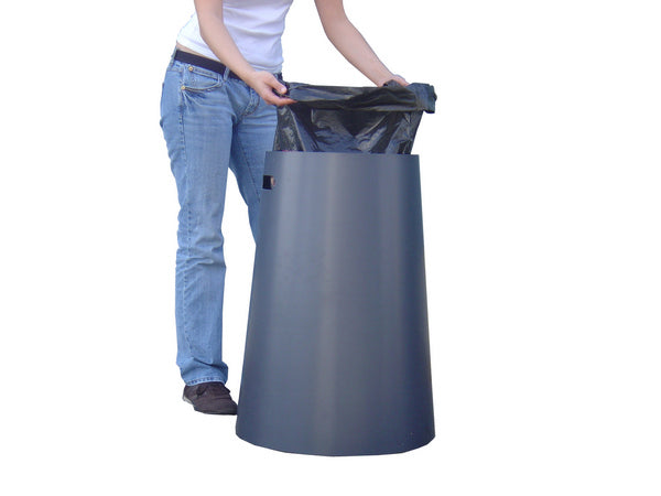 Der Abfallsackbehälter ist aus einer robusten und biegsamen Kunststoffplatte hergestellt, der zu einem konischen Zylinder gerollt und anschliessend aufgestellt wird. Darin lässt sich ein handelsüblicher 110 Liter Abfallsack versenken, befestigen, füllen und später mühelos verschnüren und entfernen.