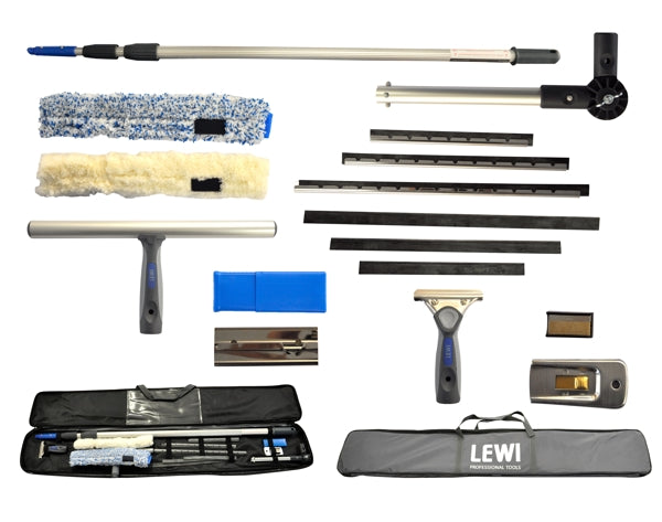 Das Fensterreinigungs-Set enthält einen Wischergriff, je 1 × Schiene hard 25, 35 und 45 cm, je 1 × Ersatzgummi soft 25, 35 und 45 cm, eine Multi-Teleskopstange 3 × 1 m, einen Alu-Träger 35 cm, je 1 × Einwaschbezug 35 cm "Blue- und White Star", einen Sicherheitsschaber mit 4 cm Klinge, einen 5er Pack Bügelklingen, ein Gelenk für die Teleskopstange, einen Klingenhalter und eine 10er Box Ersatzklingen. Das Set ist in einer Nylon-Tasche verpackt.